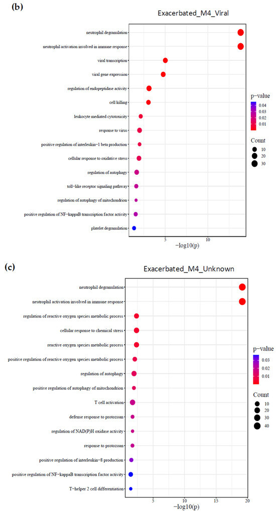 In viral exacerbation samples (Exacerbated_M4_Viral), 107 biological processes were significantly activated. Among them, biological processes related to viral infection [viral transcription, viral gene expression, response to virus, and the regulation of endopeptidase activity], pro-inflammatory response [the positive regulation of NF-kappaB transcription factor activity, the positive regulation of interleukin-1 beta production, and platelet degranulation], innate and adaptive cytotoxic responses [cell killing and leukocyte-mediated cytotoxicity], and mitochondrial damage [the regulation of mitochondrial autophagy, the regulation of autophagy, and cellular response to oxidative stress] (Figure 3b).