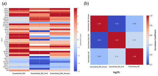 Heatmap analysis of gene expression and correlation analysis in COPD exacerbations. (a) Gene expression levels in the blood transcriptome following exacerbations in COPD patients, stratified by clinical groups (Exacerbated_M2, Exacerbated_M4_Viral, and Exacerbated_M4_Unknown). Differential expression of key genes across groups is represented. Statistical differences against stable samples p < 0.05 are identified with an asterisk (*). (b) Correlation analysis of gene expression patterns between the different clinical groups (Exacerbated_M2, Exacerbated_M4_Viral, and Exacerbated_M4_Unknown). The heatmap shows the correlation coefficients between groups, with higher values indicating greater similarity in immune responses.