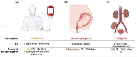 Mechanisms of allosensitization. Different ways of HLA allosensitization have been described. The differences in allosensitizations are based on different features: HLA mismatch load and time of sensitization. In transfusions, the HLA mismatch load could be up to 2 mismatched haplotypes, and the time of allosensitization stimulation is the lifespan of passenger-mismatched leukocytes (A). In pregnancy/aborts the HLA mismatch load is up to 1 mismatched haplotype, whereas the time of allosensitization ranges between 30 and 270 days (B). Finally, the allotransplant could have up to 2 mismatched haplotypes and the time of allosensitization is variable and controlled by immunosuppression (IS) in panel (C).