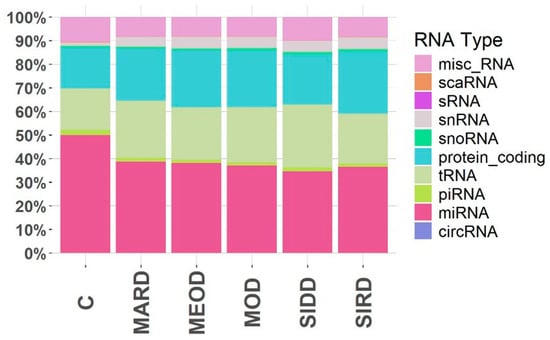 Alignment of the deduplicated reads to different small RNA biotypes was performed using the exceRpt pipeline []. Reference genome version of hg38 was used along with the precompiled small RNA library available on the exceRpt website. The total read count for miRNA, tRNA, piRNA, circularRNA, misc_RNA, snRNA, snoRNA, scaRNA, scRNA, protein_coding, and rRNA were retrieved using an in-house R package. The stacked bar graph was created using ggplot2 v3.5.1.