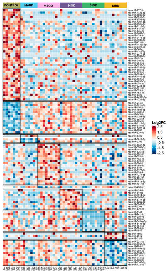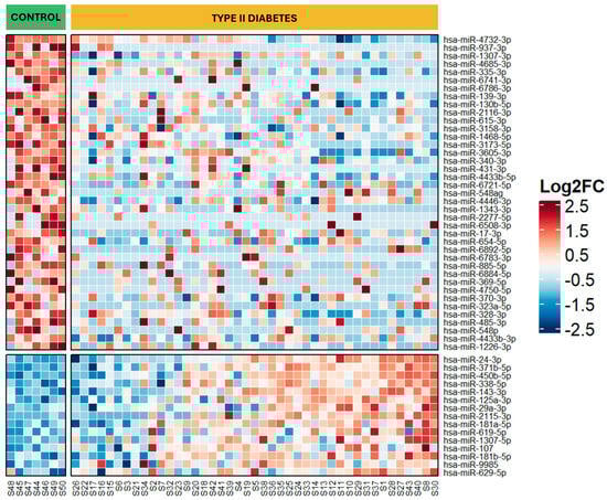 Out of the 430 circulating miRNAs expressed in serum, 57 were significantly differentially expressed between T2D patients and controls (p ≤ 0.05; log fold change ≥ 0.5). The distinct miRNA expression profiles are depicted in a heatmap (Figure 2) showing 17 upregulated and 40 downregulated miRNAs in T2D patients. The list of miRNAs is provided in Supplementary Table S3. The heatmap also highlights the heterogeneity in miRNA expression among T2D patients, contrasting with the relatively homogeneous profiles of non-T2D controls. This heterogeneity was further analyzed in patient phenotypic clusters described by Bayoumi et al. []