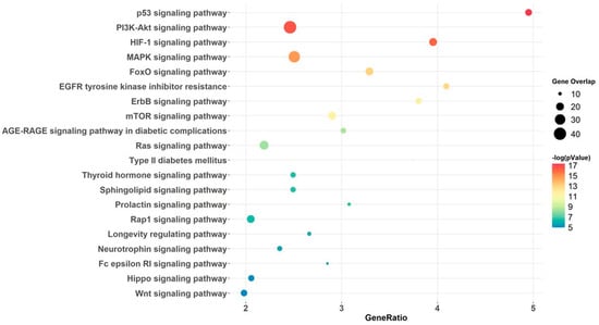 Potential target genes of the differentially expressed miRNA were identified using miRNET and MIENTURNET tools. By combining the results from both tools, we identified a total of 868 miRNA-target genes. Pathway analysis and ORA of these miRNA-target genes identified several biologically significant pathways. For further assessment, all pathways related to cancer and/or carcinogenesis were excluded. The analysis revealed enrichment of T2D-associated pathways including PI3K-AKT, MAPK, mTOR, HIF-1, AGE-RAGE, WNT and Hippo signaling (Figure 4). Subsequently, the relationship between differentially expressed miRNAs and their target genes that overlap with the T2D-related pathways was visualized via a heatmap (Supplementary Figure S2).