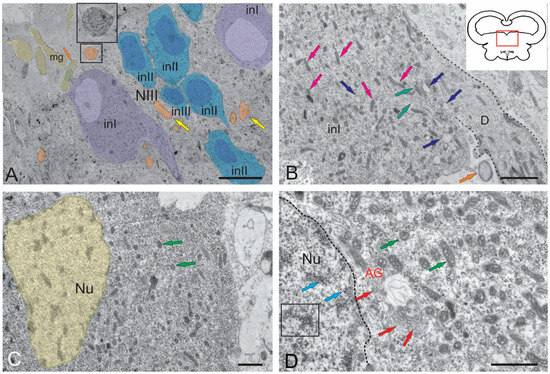 Along with neurons, oligodendroglia cells were found in the NFLM (Figure 3A,B), as well as single multidirectional myelin fibers and their bundles (Figure 3A,B). The third type of neurons (INIII) in the NFLM was represented by cells with a high nuclear-cytoplasmic index; the cytoplasm in such cells occupied 20–30% of volume (Figure 3A,B). Such cells with soma sizes of 9.08 ± 0.23 and 6.13 ± 0.22 μm (long and short axes, respectively) had a narrow rim of light granular cytoplasm where organelles were almost absent (Figure 3A, Table 1). The INIII nuclei had a high content of heterochromatin and one or more nucleoli (Figure 3A). The presence of neurons with signs of apoptosis in the ipsi- and contralateral parts of the NFLM (Figure 3A,B) were an interesting finding. Late stages of cell apoptosis with pronounced signs of nuclear fragmentation and cytoplasmic pyknosis were also observed (Figure 3B).