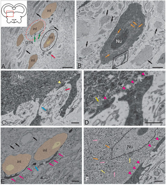 Dorsal tegmental nuclei (DTN) were clusters of large neurons in the dorsal and dorsolateral parts of the tegmentum (Figure 4A,B, Table 1). In juvenile chum salmon, DTN were represented by single large neurons with a multipolar morphology (Figure 4A). In such cells, the nucleus was not visualized, the cytoplasm had a granular appearance, the soma sizes were 20.54 (long axis) and 13.33 μm (short axis), three primary dendrites were extended from the cell body, and lipid inclusions were present in the cell (Figure 4A). Neurons with large oval somata (27.95 and 15.89 μm) were located at different depths in the parenchyma of the dorsomedial tegmentum (Figure 4B) and were characterized by the presence of lipid inclusions in the peripheral layers of the cytoplasm. Such cells were surrounded by conducting fibers of the NFLM and ascending thalamic tracts, as well as by oligodendrocytes, astrocytes, and smaller neurons (Figure 4B). Other large neurons (INI) of the DTN (40.34 and 17.95 μm) contained numerous MTs of different sizes and dense bodies in the cytoplasm, a small, elongated nucleus (10.31 and 7.29 μm) with decondensed chromatin, and a dense nucleolus (Figure 4C). Such neurons were in contact with protoplasmic astrocytes and grouped into a small cluster (Figure 4C).