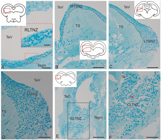 Over the past decade, ample information has been collected on the brain’s neurogenic capacity in various fish species [15,16], including the comprehensively studied zebrafish [9,17,18,19], that provides new valuable models for studying the cellular and molecular features of neurogenesis and reparative regeneration in the adult brain. The high neurogenic capacity of adult zebrafish [1] and medaka [20] can be explained by the numerous niches containing neural stem cells in their brain. Neurogenic zones have been described from the midbrain of zebrafish, including tectum opticum and torus longitudinalis [9].