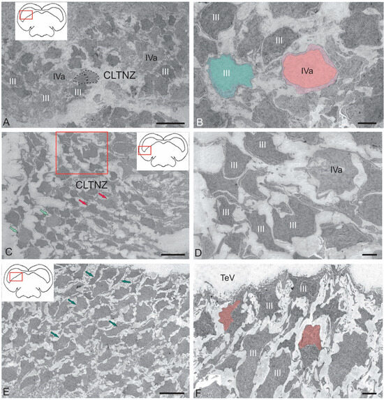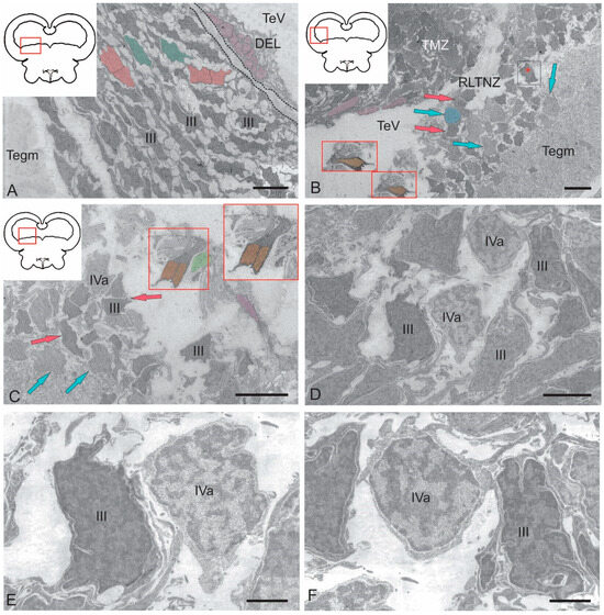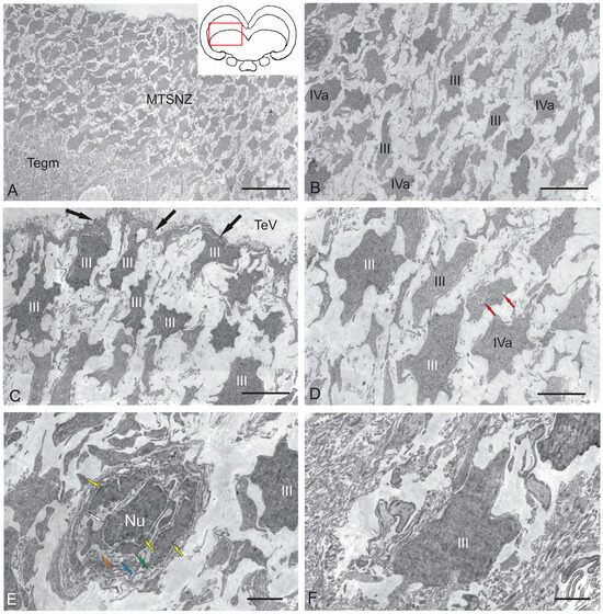 Along most of the RLTNZ, a segregation of type III cells with irregular and elongated nuclei could be observed, which were characterized by uniformly distributed chromatin, one or two visible nucleoli, and minimal cytoplasm containing few organelles (Figure 7A,B, Table 2). In some areas of the RLTNZ, type IVa cells were visible, with large nuclei containing heterochromatin and lacking nucleoli (Figure 7B,C, Table 2). An ultrastructural examination of the RLTNZ showed that this niche mainly contained type III and IVa cells (Figure 7C–F). The population of type III cells was represented by dark-stained cells with elongated nuclei (Figure 7A,C, Table 2) and cells with irregular nuclei (Figure 7C–E, Table 2). Moreover, many of the type III cells were oriented parallel to the TeV (Figure 7A). Type IVa cells in the RLTNZ were lightly stained cells with heterochromatin and a narrow rim of cytoplasm (Figure 7C–F, Table 2). Type IVa cells were often characterized by irregularly shaped nuclei with varying degrees of dark staining, reticulated chromatin, and scanty cytoplasm containing few organelles (Figure 7C–E). Type IVa cells typically formed clusters (Figure 7B,C). Adult-type glial cell division patterns were detected in the lateral regions of the RLTNZ (Figure 7B).