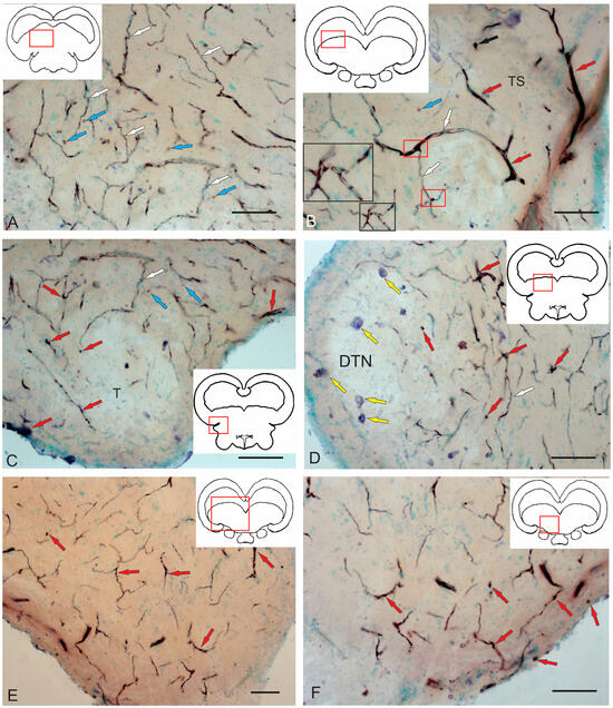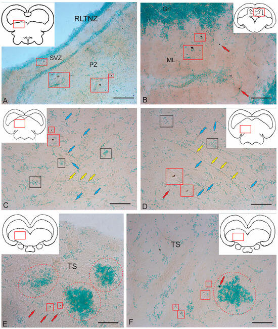 At the level of the NIII paramedian projection, the BLBP expression was detected in single cells (Figure 10C). There were also small clusters of various densities consisting of small cells, as well as patterns of cell migration along vessels (Figure 10C). In the caudo-lateral direction, similar patterns of cell migration along guides, clusters of small cells, and cell bodies of reticulospinal neurons were observed; single cells expressing the BLBP were also detected (Figure 10D). In the TS region, single BLBP-ip cells and large and dense clusters consisting of BLBP-immunonegative undifferentiated cells of an unknown nature were detected (Figure 10E). In the ventral part of the TS, single cells with BLBP-expressing nuclei were detected (Figure 10F), whose immunolabeling intensity varied from moderate to high.