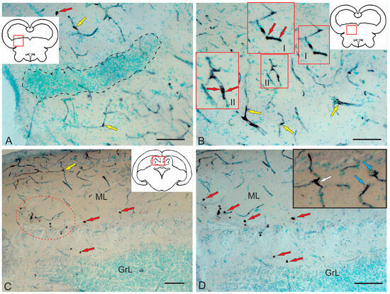 During the acute post-traumatic period, in the caudal zone of the tegmentum, BLBP-ip Bergmann glia fibers were found, located in the dorsal part of the molecular layer (ML) in the region of the valvula cerebelli (Figure 11C). The migration of immunonegative cells was observed along the tortuous BLBP-ip Bergmann glia fibers and diffuse aggregations of similar cells were observed in the upper third of the ML (Figure 11C). Terminal branches of immunopositive Bergmann glia had either simple, branched end apparatuses or typical end feet (Figure 11D inset). In deeper layers of the ML, clusters of larger, intensely labeled oval and rounded BLBP-ip cells were identified (Figure 11C), located in the lower third of the ML along with diffuse clusters of immunonegative small cells (Figure 11D).