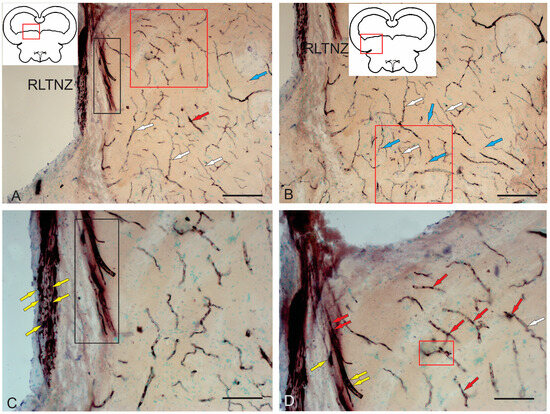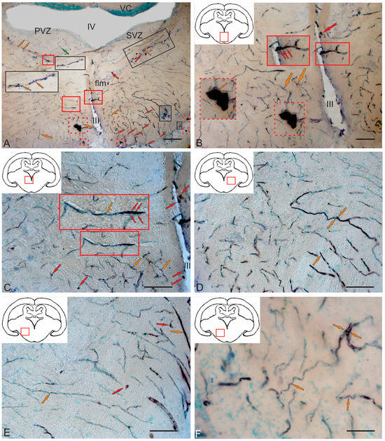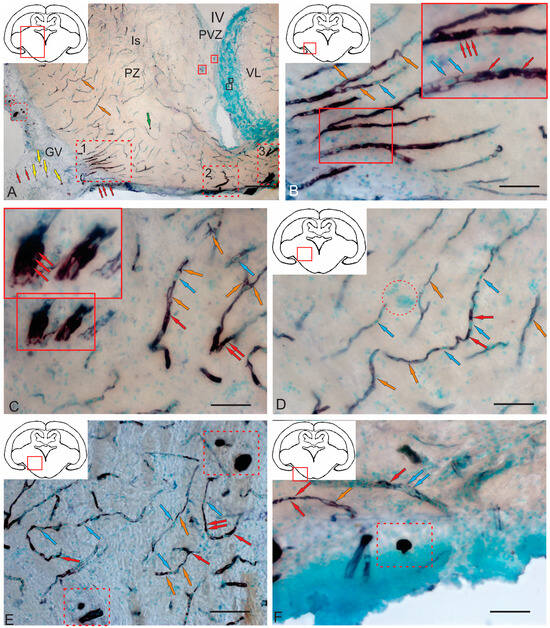 The vascular network expression could be seen in the form of venules and arterioles with various degrees, and they were labeled where necessary (Figure 1A,C). Large vessels were identified ventrally of LPVZ, along which cell migration patterns were detected (Figure 1C). The LPVZ and MPVZ contained adult neural stem cells (aNSCs) and were neurogenic regions of the tegmentum of juvenile chum salmon. To date, the neurogenic zones of the tegmentum have remained the least studied and characterized regions for fish. In this report, we, for the first time, provide an ultrastructural characterization of these zones in juvenile chum salmon.