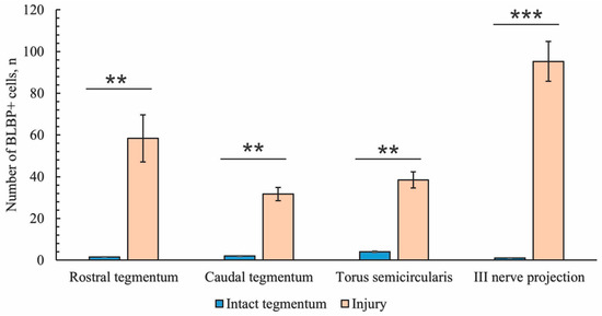 As a result of acute traumatic injury to the medulla oblongata of juvenile chum salmon, the patterns of BLBP expression in the cells and RG fibers in the mesencephalic tegmentum and neurogenic zones of the tegmentum significantly changed. The study was conducted on day 3 post-injury.