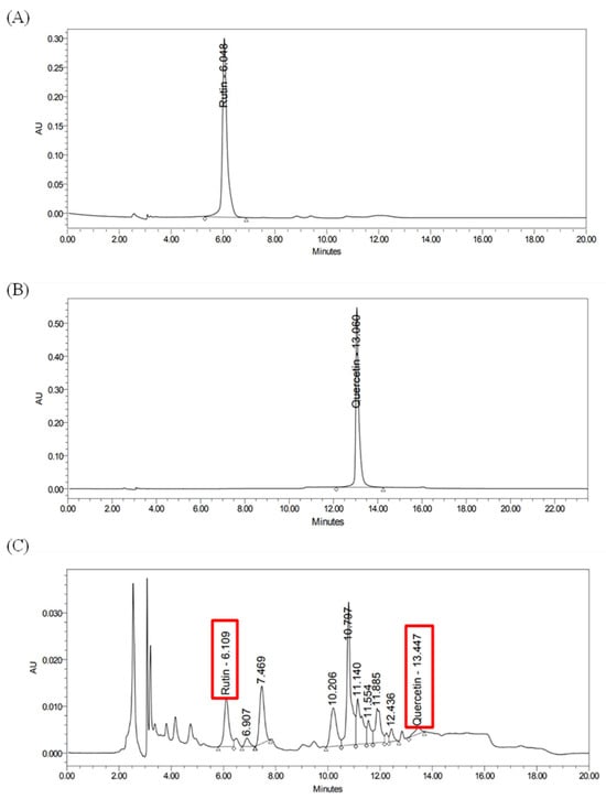 Figure 1. HPLC chromatograms of (A) pure rutin (B), pure quercetin, and (C) Ziziphus spina-christi (ZSC) methanolic leaves extract. Concentration: 0.5 mg/mL. Detection at 280 nm.