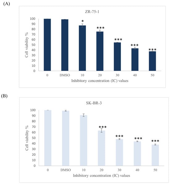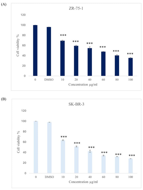 Figure 2. Effect of Ziziphus spina-christi (ZSC) extract on the viability of human epidermal growth factor receptor 2 (HER2) positive breast cancer cell lines (A) ZR-75-1 and (B) SK-BR-3 in relative with control after 48 h of incubation with a range of concentrations of the extract and dimethyl sulfoxide (DMSO) 0.5%. Data are expressed as mean values ± SEM, n = 3. One-way ANOVA test was conducted for statistical analysis followed by post hoc Tukey’s test to compare the groups and find the significance. Statistical significance was considered when the p-value was less than 0.05. *** p < 0.001.