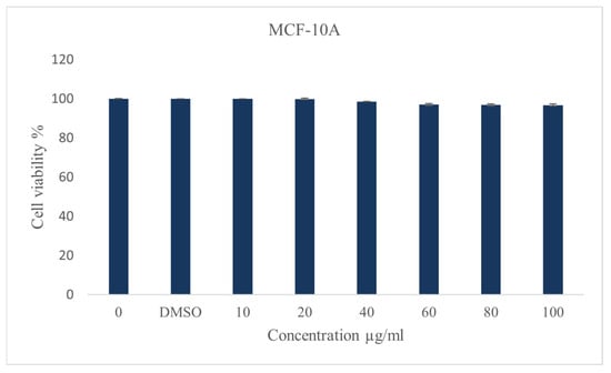 Figure 3. Effect of Ziziphus spina-christi (ZSC) extract on the viability of immortalized mammary epithelial cell line MCF-10A in relative with the control after 48 h of incubation with a range of concentrations of the extract. Data are expressed as mean values ± SEM, n = 3. One-way ANOVA test was conducted for statistical analysis followed by post hoc Tukey’s test to compare the groups and find the significance.