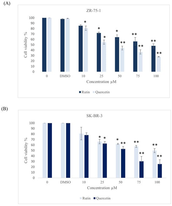 Figure 4. Effect rutin and quercetin on the viability of human epidermal growth factor receptor 2 (HER2) positive breast cancer cell lines (A) ZR-75-1 and (B) SK-BR-3 in relative with the control after 48 h of incubation with a range of concentrations of the compounds. Data are expressed as mean values ± SEM, n = 3. One-way ANOVA test was conducted for statistical analysis followed by post hoc Tukey’s test to compare the groups and find the significance. Statistical significance was considered when the p-value was less than 0.05. p < 0.05 *, p < 0.01 **.