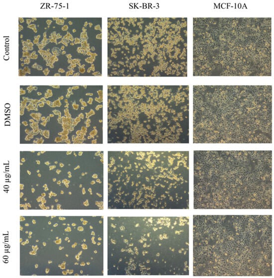 In concordance with the results obtained from the cell viability experiment, there was a marked change in cellular morphology of ZR-75-1 and SK-BR-3 cell lines after 48 h of treatment with the IC50 values of ZSC extract on both cell lines (40 and 60 µg/mL). As shown in Figure 6, both cell lines appeared stressed, deformed, and shrunken. In addition, many cells were floating in the media with a noticeable reduction in the number and contact among cells in both cell lines. On the other hand, when MCF-10A cells were treated with ZSC extract (40 and 60 µg/mL) to evaluate their safety, the morphology of the cells was maintained. The cells were healthy and confluent, with no apparent changes or abnormal observations on their phenotype (Figure 6).