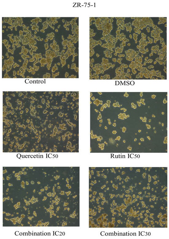 Figure 7. Cell morphology of human epidermal growth factor receptor 2 (HER2) positive breast cancer cell line ZR-75-1 after 48 h of treatment with rutin, quercetin, and rutin/quercetin combination at different inhibitory concentrations. The magnification scale of the images is 10×. n = 3.
