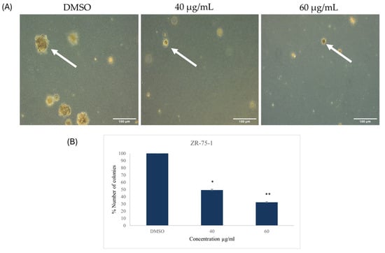 A soft agar colony formation assay was performed to observe the formation of colonies in soft agar, which reflects tumor formation in vivo. The observation of the cells throughout the incubation period revealed that at both concentrations, the extract had significantly decreased the number of colonies in both cell lines when compared with the control; in addition, upon visual observation, the sizes of the colonies formed in the treated groups were smaller than their respective controls (Figure 9 and Figure 10). After three weeks, the number of colonies in treated and untreated cells was quantified, showing 50.8 ± 1.2% and 67.7 ± 0.9% reduction at 40 and 60 µg/mL, respectively, in the ZR-75-1 cell line, whereas in SK-BR-3 cell line there was 38.6 ± 2.1% and 57.2 ± 1.8% reduction at 40 and 60 µg/mL, respectively (Figure 9 and Figure 10).