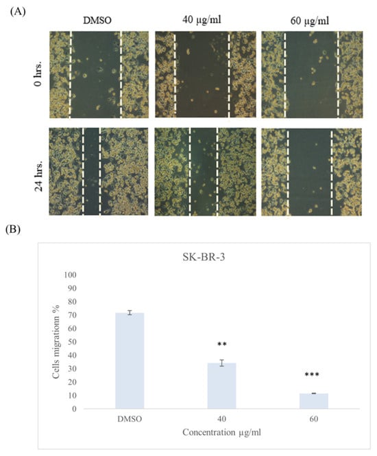Figure 12. (A) Cell migration of SK-BR-3 cell line after 24 h of treatment with 40 and 60 µg/mL of Ziziphus spina-christi (ZSC) extract. The magnification scale of the images is 10×. (B) Quantitative analysis represents the percent of cell migration after 24 h. For statistical analysis, the one-way ANOVA test was conducted followed by post hoc Tukey’s test to compare the groups and find the significance. Statistical significance was considered when the p-value was less than 0.05. ** p < 0.01, *** p < 0.001.