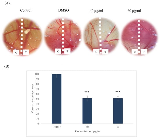 The embryos were treated with ZSC extract (40 and 60 µg/mL), DMSO (0.1%), and control for 48 h, then the angiogenesis bed for each embryo was visualized under the microscope. There was an apparent inhibition in the formation of blood vessels in the embryos exposed to the extract. After normalization with the unexposed area within the same embryo and comparison with the external controls, the results revealed that the extract had significantly reduced the formation of blood vessels, thus indicating its anti-angiogenetic potential. We found that ZSC extract inhibited the formation of blood vessels to 51.4 ± 4.4% and 51.2 ± 4% at 40 µg/mL and 60 µg/mL, respectively (Figure 15). The effect was dose-independent, as the percentage reduction was the same in each concentration, pointing out that 40 µg/mL was the least effective concentration for inhibiting angiogenesis.