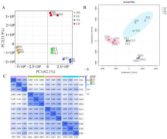 Principal component analysis (PCA) is a statistical tool used to identify the internal structure among multiple variables by reducing them to a smaller number of principal components. The PCA results revealed that the explained variances for PC1 and PC2 were 62.1% and 23.9%, respectively (Figure 1A). This indicated that the three replicate samples within the same region were closely clustered; whereas, significant differences in metabolite distribution were observed across the four different habitats (Figure 1A). Specifically, samples from Chengduo County (CD) and Guoluo County (GL) were close along PC1 but exhibited substantial differences along PC2 (Figure 1A). In contrast, samples from Henan County (HN) and GL clustered closely along PC2; whereas, considerable diversity was observed along PC1 (Figure 1A).