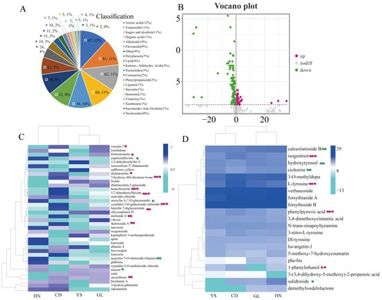 Metabolites profiling of P. rotata roots from four habitats. (A) Classification and proportion of all metabolites. (B) Volcano map of the distribution of metabolites among four habitats. The horizontal dash line means the boundary between significant and insignificant metabolites. (C) Heatmap of 38 flavonoid. (D) Heatmap of 21 PhGs. Light blue represents the low content, deep blue represents high content. Gray arrow represents a clustering branch in row and column. The five-pointed star represents the relationship between the content of metabolites and altitude. Green five-pointed star: negative relationship, red five-pointed star: positive relationship. One five-pointed star at p < 0.05, two five-pointed stars at p < 0.01, three five-pointed stars at p < 0.001.