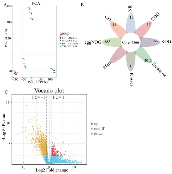 Transcriptomic analysis in P. rotata roots from four habitats. (A) Transcriptomic PCA of P. rotata roots from four different habitats. (B) Annotation of eight major databases. (C) Distribution of upregulation and downregulation of differentially expressed genes among four habitats. Upmodulated transcripts in red, downmodulated transcripts in yellow, nondifferent transcripts in blue. The horizontal dash line means the boundary between significant and insignificant of transcripts.