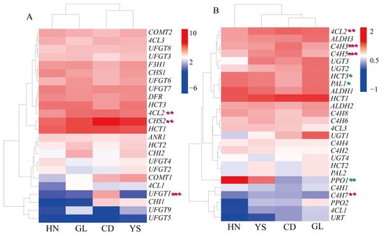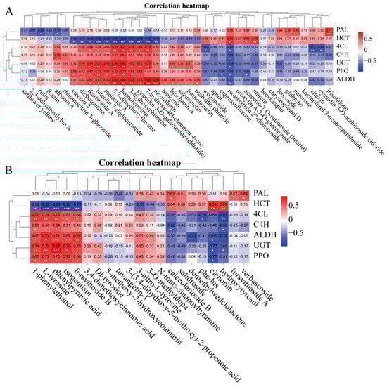 Correlation between genes expression and the content of the major metabolites in P. rotata roots from four habitats. (A) Correlation between genes expression and the content of the flavonoid compounds. (B) Correlation between genes expression and the content of the phenylethanoid glycoside compounds. Gray arrow represents a clustering branch in row and column. One star at p < 0.05, two stars at p < 0.01, three stars at p < 0.001.