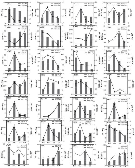 This study selected 28 genes involved in PhG and flavonoid biosynthesis to examine their expression patterns across four habitats using qRT-PCR. This process validated the transcriptomic analysis data (Figure 5). With the exception of the PAL1 gene, the expression trends of the other genes assessed by qRT-PCR were consistent with the FPKM values from the transcriptomic analysis, reinforcing the reliability of the transcriptomic data (Figure 5). The relative expression levels of the PAL1, CHS1, DFR, and C4H1 genes demonstrated a decreasing trend (Figure 5). Conversely, the relative expression of the CHS2, UFGT1, C4H3, and C4H5 genes showed an increasing trend (Figure 5). The expression patterns of the PAL2, 4CL1, CHI1, CHI2, F3′H, ALDH, HCT2, HCT3, PPO2, UFGT2, and UGT3 genes initially increased before subsequently decreasing (Figure 5). However, the expression of the genes 4CL2, HCT1, UGT1, UGT2, UGT4, C4H2, and C4H4 exhibited irregular trends (Figure 5).