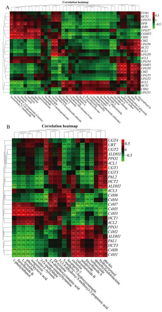 Correlation analysis was performed on metabolites and genes related to the biosynthesis pathways of flavonoids and PhGs. Additionally, we analyzed the correlation between key enzymes and metabolites, as well as the association between metabolites and altitude within these metabolic pathways. All correlation analysis heat maps with tags were generated using the OmicShare tool (https://www.omicshare.cn, accessed on 10 October 2024), with one star indicating p < 0.05, two stars indicating p < 0.01, and three stars indicating p < 0.001.