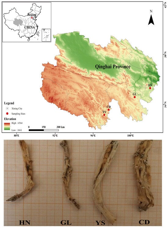 Seedlings of P. rotata were collected in four different habitats in Qinghai Province (Figure 10, Table 2). Including Henan County (HN) at an altitude of 3540 m, Guoluo County (GL) at an altitude of 3750 m, Yushu County (YS) at an altitude of 3880 m, and Chengdu County (CD) at an altitude of 4270 m. In this study, 10–15 healthy plants with stable growth were randomly selected from each region and washed with water multiple times to remove topsoil. Subsequently, the plants were disinfected with 75% ethanol for 5 min, rinsed twice with sterile water, and immediately frozen in liquid nitrogen. The frozen samples were stored in a −80 °C freezer for subsequent metabolomic and transcriptomic analysis.