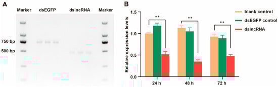 Synthesis and interference efficiency detection of dsRNA lncloc13129358. (A) Image of dsRNAs on agarose gel. (B) Efficiency of RNA interference with dslncLOC113219358 in Apis mellifera ligustica workers over time. Asterisks denote significant differences: ** p < 0.01.