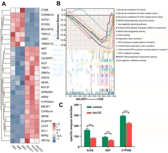 (A) Hierarchical clustering of differentially expressed genes. Red indicates relatively high expression, and blue indicates relatively low expression. (B) Gene Ontology–gene set enrichment analysis of mRNA expression in the honey bee brain. The vertical axis represents the corresponding running Enrichment Score (ES), with the peak value in the line graph indicating the ES of the gene set. ES > 0 indicates higher expression in the dsLOC group, and ES < 0 indicates higher expression in the CK group. The horizontal axis represents genes ranked in an ordered dataset. (C). Effect of lncLOC113219358 interference on enzyme activities of AChE, GST, and CYP450. Asterisks denote significant differences: ** p < 0.01.