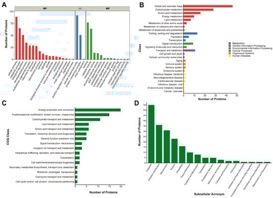 Functional annotation results of the lncLOC113219358 binding proteins. (A) GO function classification of the binding proteins. Legend: BP = Biological Process, CC = Cellular Component, MF = Molecular Function. (B) Statistic diagram of KEGG pathways annotation results. (C) COG annotation analyses of the binding proteins. (D) Subcellular localization prediction results of the binding proteins.