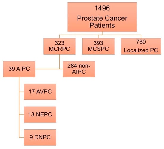 Data for 1496 patients diagnosed with prostate cancer were available for analysis in the ORIEN database. Of these, 323 (22%) were identified as mCRPC. Of the patients with mCRPC, 39 (12%) met our predefined AIPC criteria, and 284 (88%) were non-AIPC. Among the 39 AIPC samples, 13 (33%) were NEPC, 17 (44%) AVPC, and 9 (23%) DNPC (Figure 1). Of note, no patients had small-cell morphology reported on biopsy.