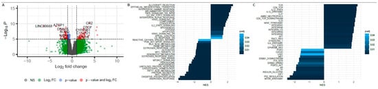 Differentially expressed genes in AIPC vs. non-AIPC: (A) Gene expression (mRNA) in AIPC vs. non-AIPC. (B) GSEA of hallmark performed on differentially expressed genes (AIPC vs. non-AIPC) detected by the Wilcoxon test (padj < 0.05). (C) Selected results of GSEA of Pathway Interaction Database (PID) performed on differentially expressed genes (AIPC vs. non-AIPC) detected by the Wilcoxon test (padj < 0.05).