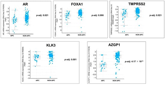 In the non-AIPC cohort, 227 genes had significantly higher expression compared with AIPC (p-adjusted < 0.01) (Figure 2A). Of these, the top ten protein-coding genes included AZGP1, ALOX15B, DCXR, NCAPD3, DNAH5, FASN, SLC39A6, SORD, STEAP2, and HIPK2 (Table 3).