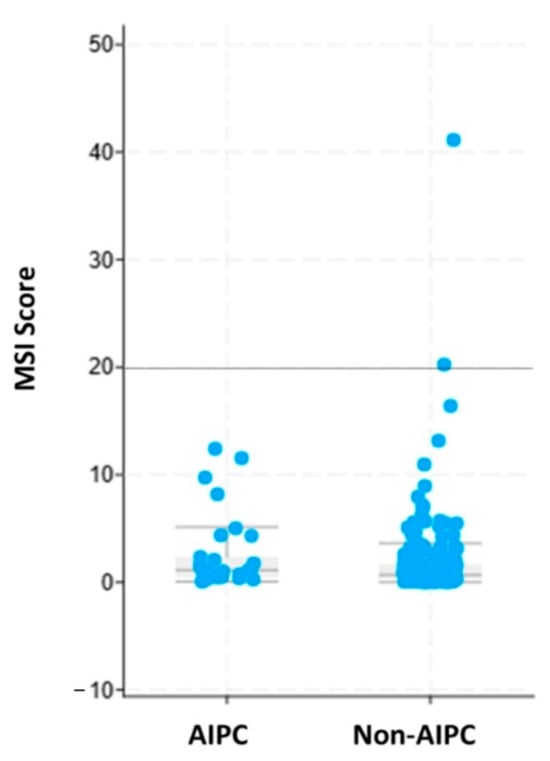 Homologous recombination deficiency (HRD) did not differ significantly between cohorts, with a mean HRD score in AIPC of 5.85 and 6.46 in non-AIPC (p = 0.99). Tumor mutational burden (TMB) did not differ significantly between cohorts, with a mean TMB of 13.9 in AIPC and 9.05 in non-AIPC (p = 0.7). Microsatellite instability (MSI) score calculated using MSIsensor2 [] was significantly higher in AIPC compared with non-AIPC (2.77 vs. 1.64, p = 0.019). Utilizing the recommended cutoff of 20% for MSIsensor2, zero of the AIPC samples and two (0.8%) non-AIPC samples were determined to be MSI-high (MSI-H) (Figure 5).