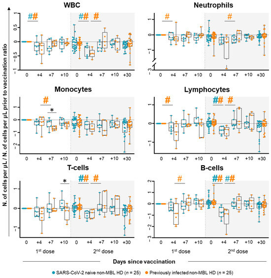 Figure 1. Kinetics of the major populations of leukocytes with a statistically significant different distribution in blood of SARS-CoV-2 naïve vs. previously infected non-MBL HD following SARS-CoV-2 vaccination. Data expressed as the ratio (considering 0 as no change vs. pre-vaccination time point) between the absolute cell count/μL of each cell population and the cell count detected for the same cell population at baseline, prior to vaccination. Subjects without previous contact with SARS-CoV-2 (n = 25; blue dots) and those who had been previously infected by the virus (n = 25; orange dots) are grouped according to the number of days from the administration of the vaccine. Notched boxes represent 25th and 75th percentile values (IQR), whereas the line in the middle corresponds to median values, and whiskers represent the maximum and minimum values observed for each group. * Statistically significant differences (p ≤ 0.05) between SARS-CoV-2 naïve vs. previously infected non-MBL HD; # Statistically significant differences (p ≤ 0.05) between the time point analyzed and the previous one for each (color-coded) group of individuals. Hashtags (#) depicted in bold refer to statistically significant differences when considering (more stringent) FDR (<5% vs. <10%) for multiple comparisons. Abbreviations: HD, healthy donors; IQR, interquartile range; MBL, monoclonal B-cell lymphocytosis; WBC, white blood cells.