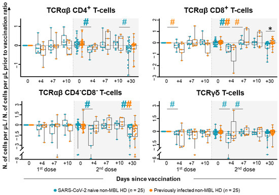 Figure 2. T-cell subset kinetics in the blood of SARS-CoV-2 naïve vs. previously infected non-MBL HD following SARS-CoV-2 vaccination. Data expressed as the ratio (considering 0 as no change vs. pre-vaccination time point) between the absolute cell count/μL of each cell population and the cell count detected for the same cell population at baseline, prior to vaccination. Subjects without previous contact with SARS-CoV-2 (n = 25; blue dots) and those who had been previously infected by the virus (n = 25; orange dots) are grouped according to the number of days from the administration of the vaccine. Notched boxes represent 25th and 75th percentile values (IQR), whereas the line in the middle corresponds to median values, and whiskers represent the maximum and minimum values observed for each group. * Statistically significant differences (p ≤ 0.05) between SARS-CoV-2 naïve vs. previously infected non-MBL HD; # Statistically significant differences (p ≤ 0.05) between the time point analyzed and the previous one for each (color-coded) group of individuals. Hashtags (#) depicted in bold refer to statistically significant differences when considering (more stringent) FDR (<5% vs. <10%) for multiple comparisons. Abbreviations: HD, healthy donors; IQR, interquartile range; MBL, monoclonal B-cell lymphocytosis; TCR, T-cell receptor.