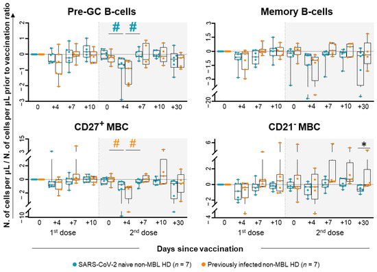 Figure 3. B-cell subset kinetics in blood of SARS-CoV-2 naïve vs. previously infected non-MBL HD following SARS-CoV-2 vaccination. Data expressed as the ratio (considering 0 as no change vs. pre-vaccination time point) between the absolute cell count/μL of each cell population and the cell count detected for the same cell population at baseline, prior to vaccination. Subjects without previous contact with SARS-CoV-2 (n = 7; blue dots) and those who had been previously infected by the virus (n = 7; orange dots) are grouped according to the number of days from the administration of the vaccine. Notched boxes represent 25th and 75th percentile values (IQR), whereas the line in the middle corresponds to median values, and whiskers represent the maximum and minimum values observed for each group. * Statistically significant differences (p ≤ 0.05) between SARS-CoV-2 naïve vs. previously infected non-MBL HD; # Statistically significant differences (p ≤ 0.05) between the time point analyzed and the previous one for each (color-coded) group of individuals. Hashtags (#) depicted in bold refer to statistically significant differences when considering (more stringent) FDR (<5% vs. <10%) for multiple comparisons. Abbreviations: GC, germinal center; HD, healthy donors; IQR, interquartile range; MBL, monoclonal B-cell lymphocytosis; MBC, memory B-cells.