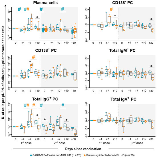 Figure 4. Kinetics of plasma cell subsets in blood grouped by their IgH isotype expression and maturation subsets in SARS-CoV-2 naïve vs. previously infected non-MBL HD following SARS-CoV-2 vaccination. Data expressed as the ratio (considering 0 as no change vs. pre-vaccination time point) between the absolute cell count/μL of each cell population and the cell count detected for the same cell population at baseline, prior to vaccination, using a logarithmic scale. Subjects without previous contact with SARS-CoV-2 (n = 25; blue dots) and those who had been previously infected by the virus (n = 25; orange dots) are grouped according to the number of days from the administration of the vaccine. Notched boxes represent 25th and 75th percentile values (IQR), whereas the line in the middle corresponds to median values, and whiskers represent the maximum and minimum values observed for each group. * Statistically significant differences (p ≤ 0.05) between SARS-CoV-2 naïve vs. previously infected non-MBL HD; # Statistically significant differences (p ≤ 0.05) between the time point analyzed and the previous one for each (color-coded) group of individuals. Hashtags (#) depicted in bold refer to statistically significant differences when considering (more stringent) FDR (<5% vs. <10%) for multiple comparisons. Abbreviations: HD, healthy donors; Ig, immunoglobulin; IQR, interquartile range; MBL, monoclonal B-cell lymphocytosis; PC, plasma cells.