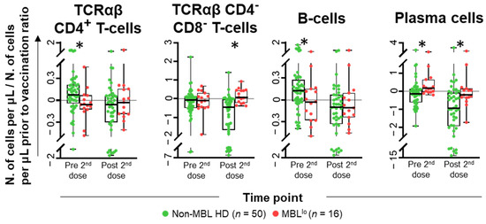 Figure 6. Kinetics of the major populations of leukocytes with a significantly different distribution in the blood of MBLlo vs. non-MBL HD after SARS-CoV-2 vaccination. Data expressed as the ratio (considering 0 as no change vs. pre-vaccination time point) between the absolute cell count/μL of each cell population and the cell count detected for the same cell population at baseline, prior to vaccination. Subjects without MBL (n = 50; green dots) and with MBLlo (n = 16; red dots) are grouped according to the time from the administration of the vaccine. Notched boxes represent 25th and 75th percentile values (IQR), whereas the line in the middle corresponds to median values, and whiskers represent the maximum and minimum values observed for each group. * Statistically significant differences (p ≤ 0.05) between MBLlo vs. non-MBL HD. Abbreviations: HD, healthy donors; IQR, interquartile range; MBL, monoclonal B-cell lymphocytosis; TCR, T-cell receptor.