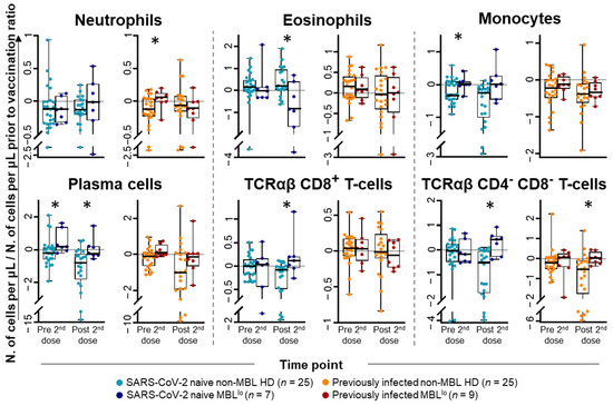 Figure 7. Leukocyte subset kinetics with a significantly different distribution in blood of MBLlo vs. non-MBL HD after SARS-CoV-2 vaccination, grouped according to previous exposure to the virus. Data expressed as the ratio (considering 0 as no change vs. pre-vaccination time point) between the absolute cell count/μL of each cell population and the cell count detected for the same cell population at baseline, prior to vaccination. Subjects without previous contact with SARS-CoV-2 (MBLlo, dark blue dots, n = 7; non-MBL, light blue dots, n = 25) and those who had been previously infected by the virus (MBLlo, red dots, n = 9; non-MBL, orange dots, n = 25) are grouped according to the time from the administration of the vaccine. Notched boxes represent 25th and 75th percentile values (IQR), whereas the line in the middle corresponds to median values, and whiskers represent the maximum and minimum values observed for each group. * Statistically significant differences (p ≤ 0.05) between MBLlo vs. non-MBL HD. Abbreviations: HD, healthy donors; IQR, interquartile range; MBL, monoclonal B-cell lymphocytosis; TCR, T-cell receptor.