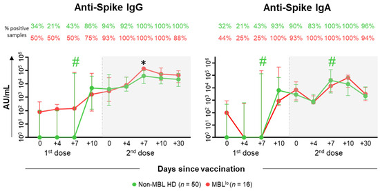 Figure 8. Kinetics of the SARS-CoV-2 specific antibody plasma levels in MBLlo vs. non-MBL HD after SARS-CoV-2 vaccination. Plasma levels (AU/mL) of anti-spike SARS-CoV-2 specific IgG and IgA antibodies in MBLlo vs. non-MBL HD, using a logarithmic scale. Subjects without MBL (n = 50; green dots) and with MBLlo (n = 16; red dots) are grouped according to the number of days from the administration of the vaccine. Whiskers represent 25th and 75th percentile values (IQR), whereas the point in the middle corresponds to median values. Percentages in the figure panels indicate the proportion of samples with detectable antibodies in plasma. * Statistically significant differences (p ≤ 0.05) between MBLlo vs. non-MBL HD. # Statistically significant differences (p ≤ 0.05) between the time point analyzed and the previous one for each (color-coded) group of individuals. Abbreviations: AU, arbitrary units; HD, healthy donors; Ig, immunoglobulin; IQR, interquartile range; MBL, monoclonal B-cell lymphocytosis; NK, natural killer; TCR, T-cell receptor.