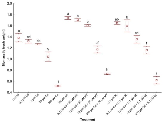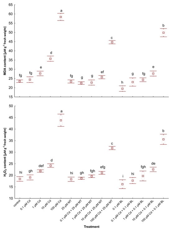 Furthermore, duckweed grown with low-dose Cd (0.1 µM) in combination with either hormone displayed lower stress marker levels than the control group despite an increase in these compounds in plants by 0.1 µM Cd addition. However, the scenario differed slightly at 1 µM Cd: MDA accumulation decreased in plants treated with 1 µM Cd and 25 µM MT compared to the control, while the MDA level in plants exposed to 1 µM Cd and 0.1 µM BL was higher than in untreated duckweed.