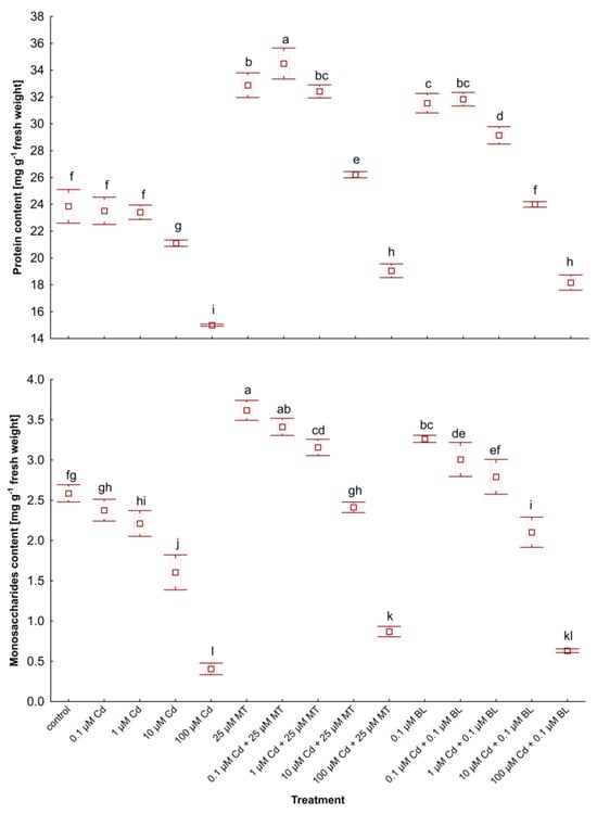 The level of soluble proteins and monosaccharides in W. arrhiza treated with Cd or/with MT or BL after 7 days of breeding. The square represents the mean (n = 5, biological replicate). The upper and lower hinges indicate the upper and lower bounds of the 95% confidence interval for the means. The upper and lower whiskers extend from the hinge to the mean ± standard deviation. Means denoted by the same letters are not significantly different (p ≥ 0.05), as determined by Tukey’s post hoc test. Abbreviations are explained in the Abbreviations section.