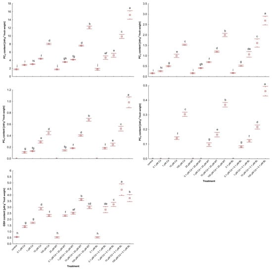 The level of PC2, PC3, PC4, PC5, and GSH in W. arrhiza treated with Cd or/with MT or BL after 7 days of breeding. The square represents the mean (n = 5, biological replicate). The upper and lower hinges indicate the upper and lower bounds of the 95% confidence interval for the means. The upper and lower whiskers extend from the hinge to the mean ± standard deviation. Means denoted by the same letters are not significantly different (p ≥ 0.05), as determined by Tukey’s post hoc test. Abbreviations are explained in the Abbreviations section.