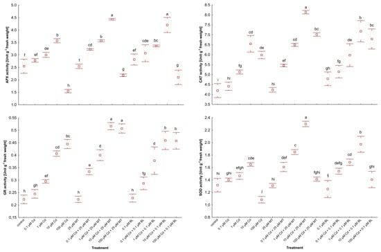 The capacity to synthesize antioxidants is crucial for plant responses to different environmental stresses [,]. The impact of MT and BL on ascorbate peroxidase (APX), catalase (CAT), glutathione reductase (GR), and superoxide dismutase (SOD) in W. arrhiza treated with Cd is illustrated in Figure 5.