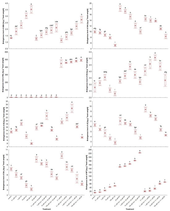 The interaction between MT or BL and other phytohormones under Cd stress conditions is not well understood, especially on the endogenous phytohormone levels. Generally, both MT [] and BL [] can interact with other phytohormones, enhancing plant tolerance to stress. Therefore, the primary focus of this work is to compare the effects of MT and BL on the content of phytohormones in W. arrhiza treated with Cd. It was reported that ABA, two AXs, i.e., IAA and PAA; nine BRs, including BL, EBL, HBL, norBL, CT, CS, ECS, TY, and 6TY; fifteen CKs, e.g., tZ, and tZR; GA3 and MT were detected in W. arrhiza.