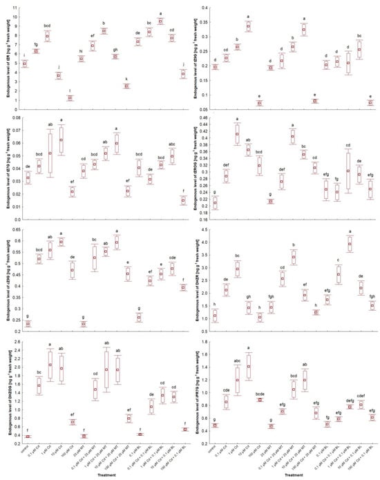 The level of selected conjugated cytokinins in W. arrhiza treated with Cd or/with MT or BL after 7 days of breeding. The square represents the mean (n = 5, biological replicate). The upper and lower hinges indicate the upper and lower bounds of the 95% confidence interval for the means. The upper and lower whiskers extend from the hinge to the mean ± standard deviation. Means denoted by the same letters are not significantly different (p ≥ 0.05), as determined by Tukey’s post hoc test. Abbreviations are explained in the Abbreviations section.